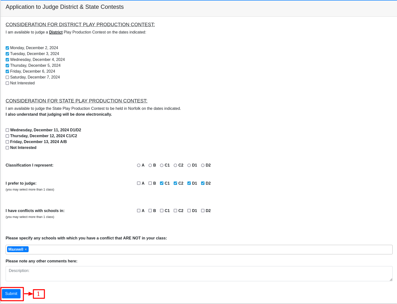 This page allows judges to indicate their availability, preferences, and potential conflicts for judging district and state Play Production contests. Users can select available dates, classifications, and note any conflicts with schools for Play Production.