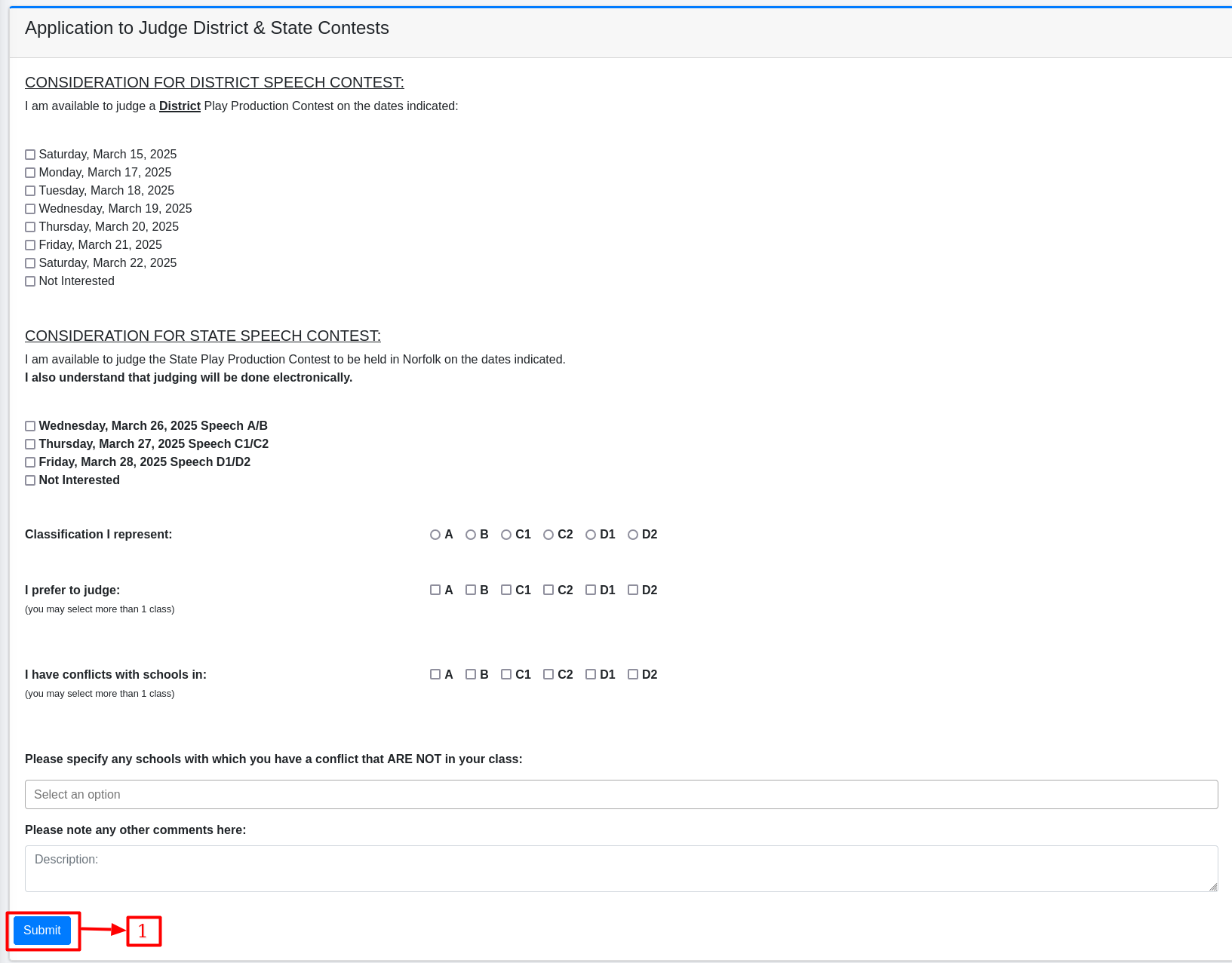 Located at the bottom of the form, the (No.1): Submit button allows judges to save their application details.