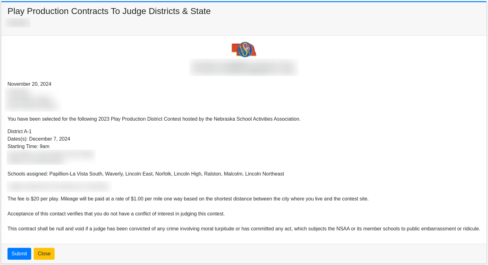 Clicking on a contract opens the confirmation form for the selected contest. You can submit the form by clicking the Submit button At the bottom of the form, a Close button allows you to close the form when finished.