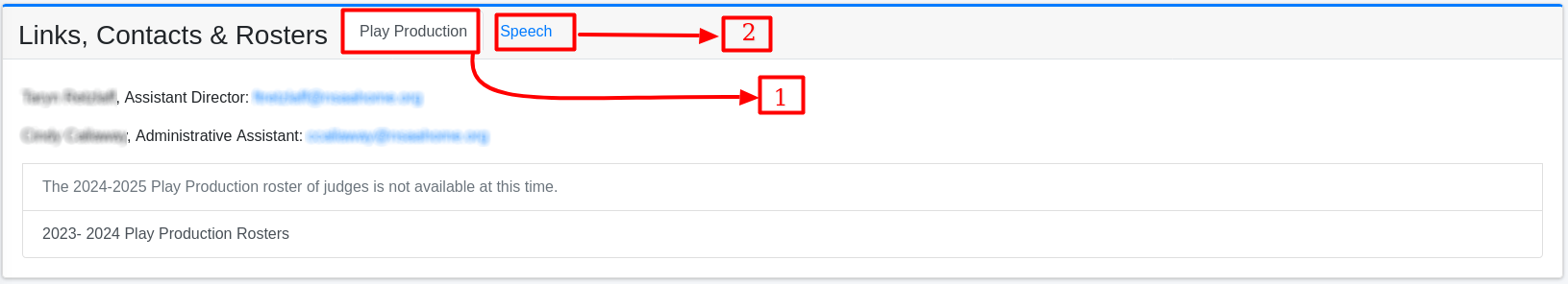Play Production Tab (No. 1): This tab is selected to display Play Production contacts and rosters. Speech Tab (No. 2): Clicking this tab will switch to displaying contacts and rosters related to Speech.